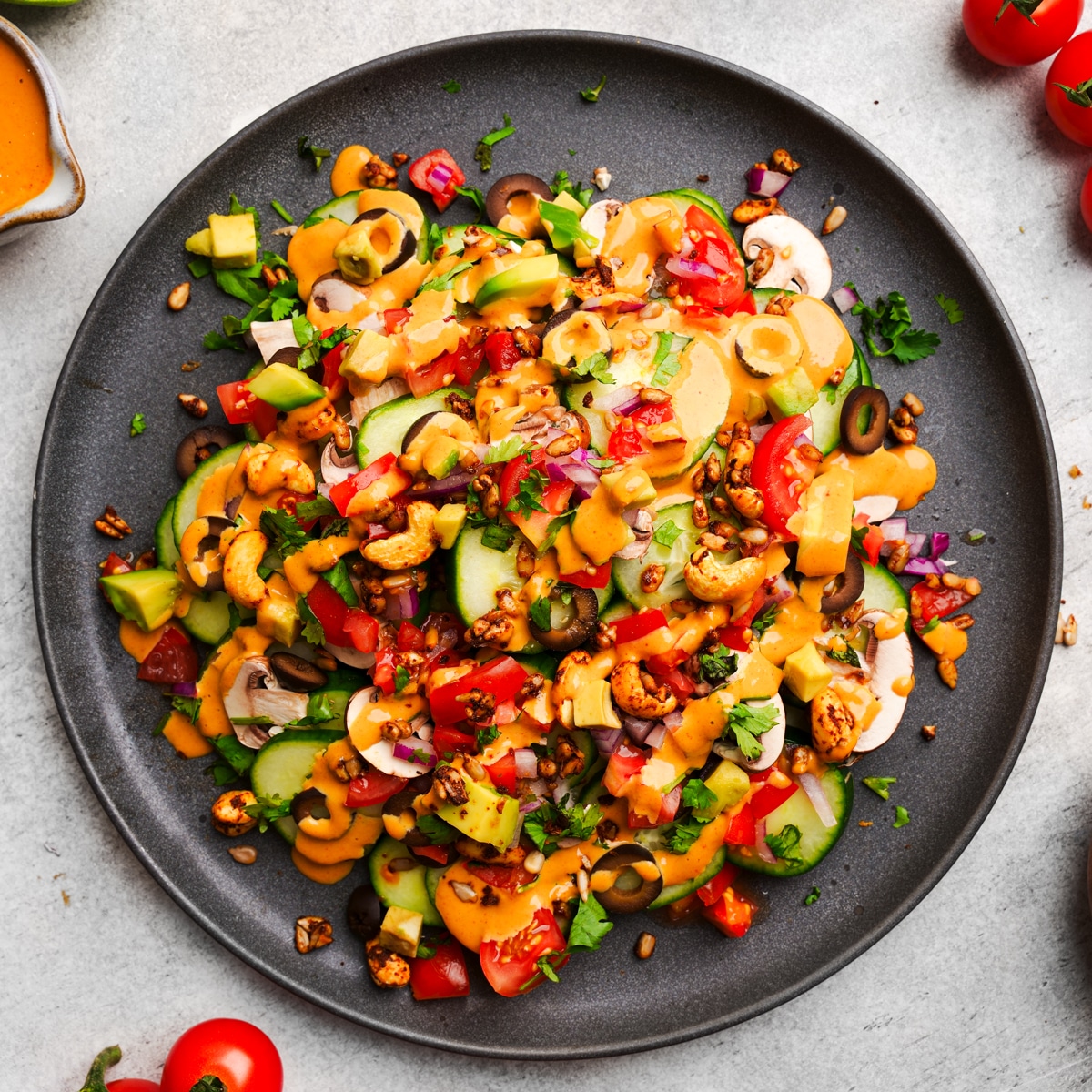 - Pour the vegan nacho cheese sauce on top and add the pico de gallo mixture. Top with chopped fresh cilantro and Sol-Ti Spicy Chipotle Supermix. Serve right away and enjoy!