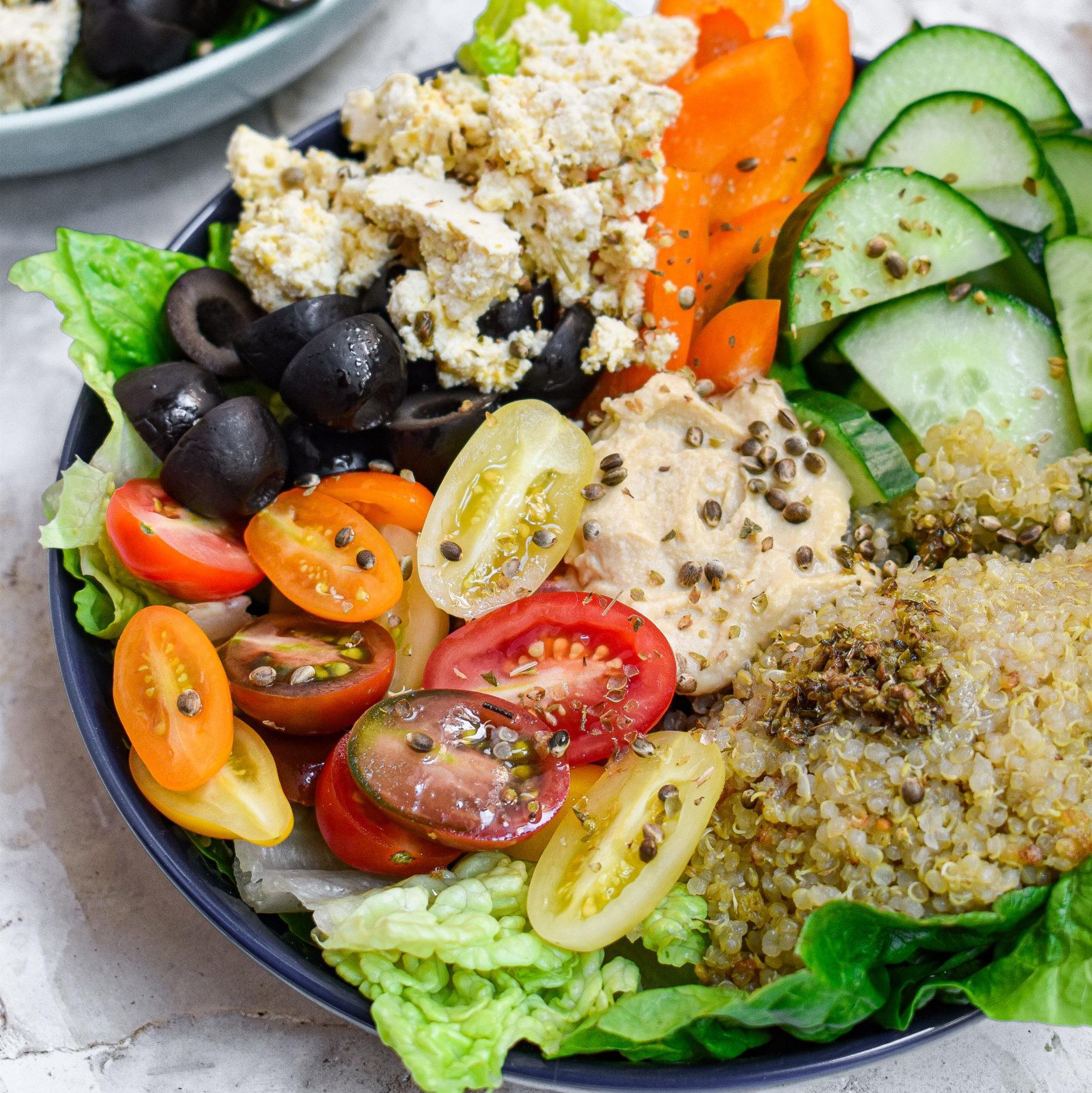 When I first went vegan I was so concerned about not getting enough protein because that was the stereotype around being vegan that I had always heard. Funnily enough, I actually started eating more protein after going vegan, because I loved the taste of all the plant based protein options out there. Bowls like this Mediterranean Buddha bowl make it easy to get all your necessary protein on a vegan diet.