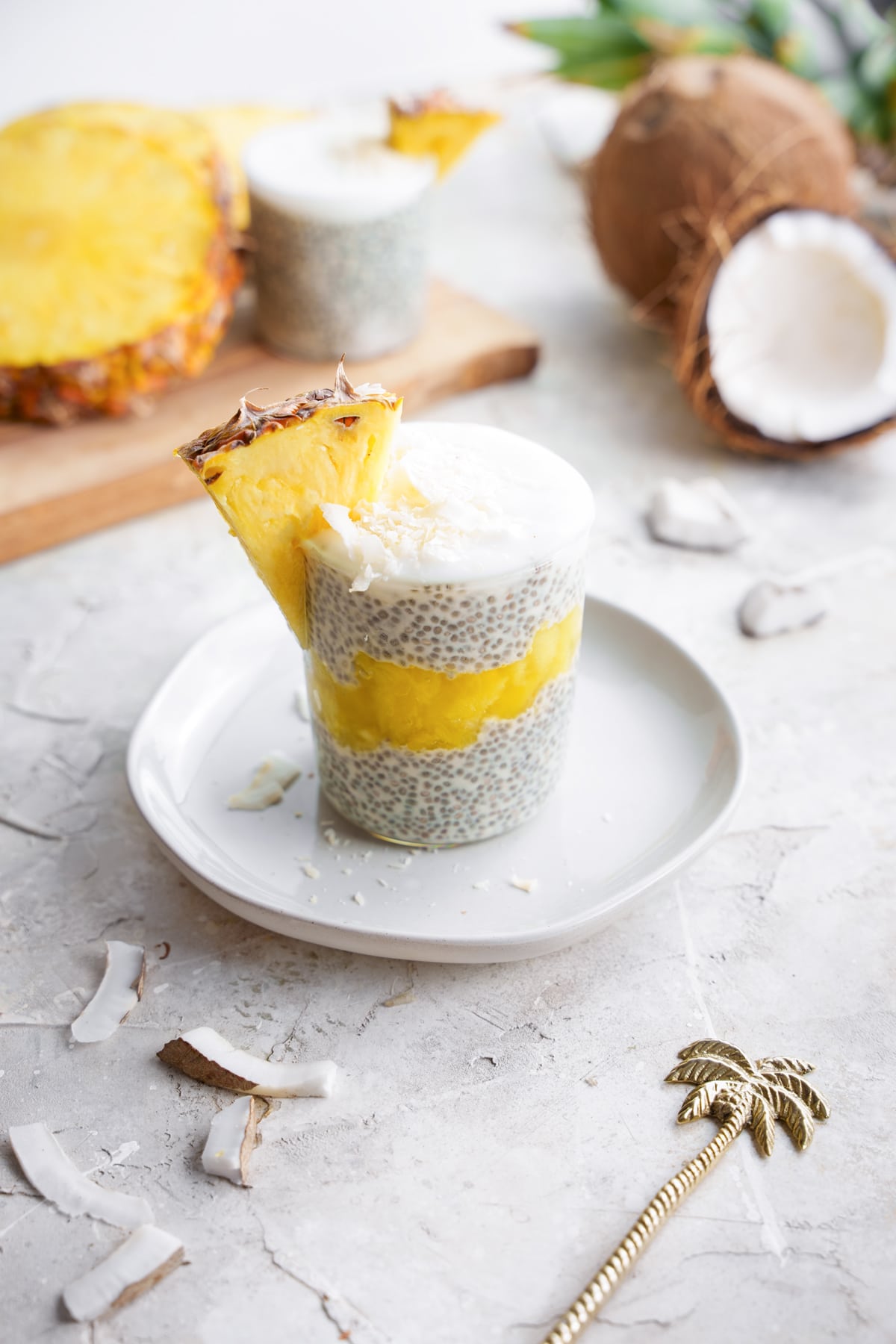 - In a bowl mash the pineapple. Assemble the cups by scooping the chia pudding into cups and then add the pineapple in the middle and topping with more chia pudding and vegan yogurt. Serve and enjoy!