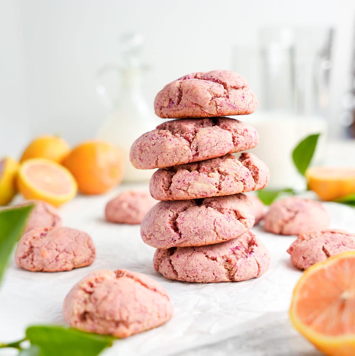 I was inspired to make these vegan lemon crinkle cookies after stumbling upon pink lemons at Whole Foods. To be completely honest with you all I had no idea that pink lemons were actually real. Pink lemonade may be the one flavor that reminds me of my childhood the most. The pink lemonade I am reminded of I am sure is far from healthy. However these vegan lemon cookies are super healthy!