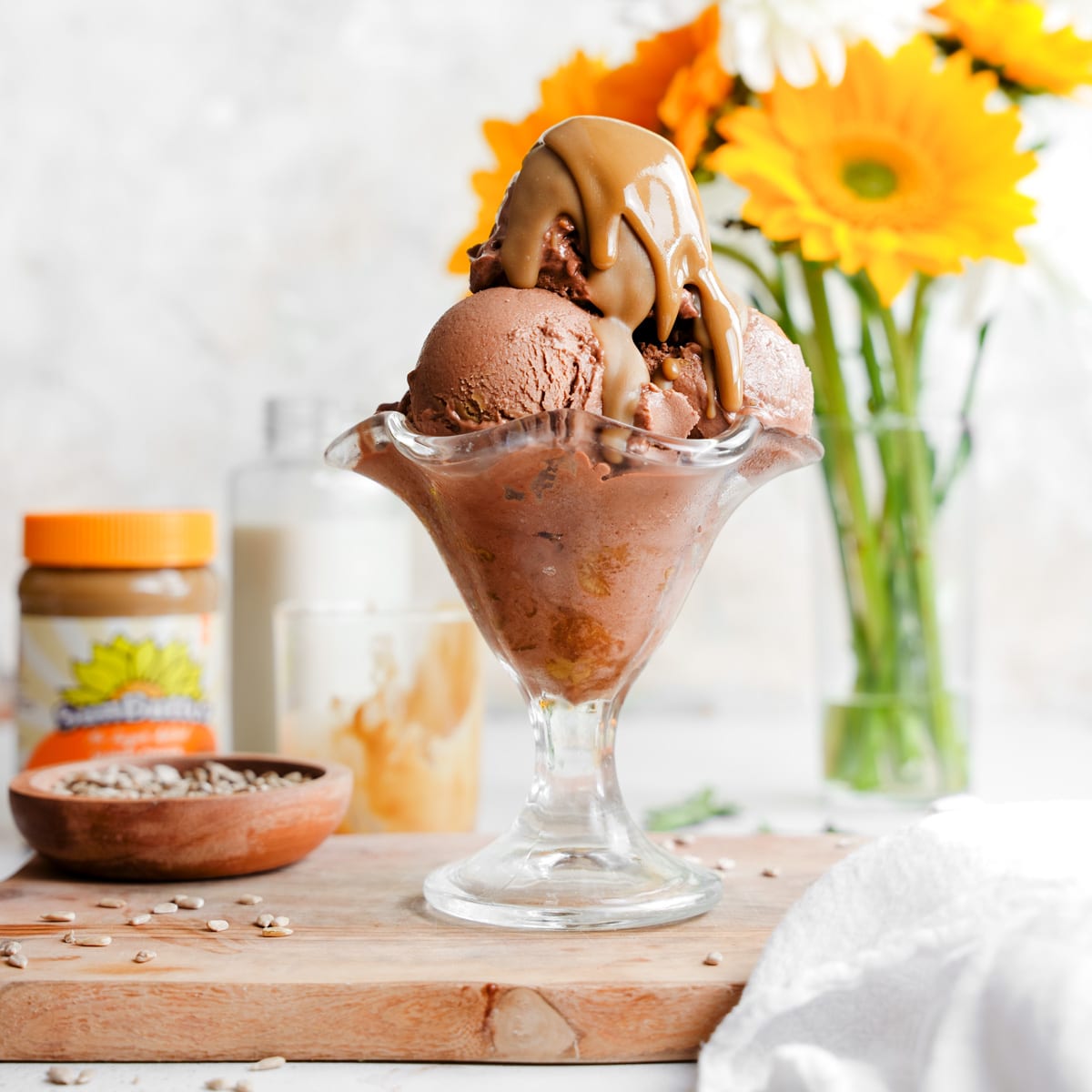 Two things that always remind me of summertime are sunflowers and ice cream. The first thing you should know about me is that I love ice cream, so why not combine them and create the most delicious sunflower butter ice cream? After seeing how delicious Sunbutter was in my Sunflower Seed Cookies, I knew it was time to create more delicious Sunbutter dessert recipes!