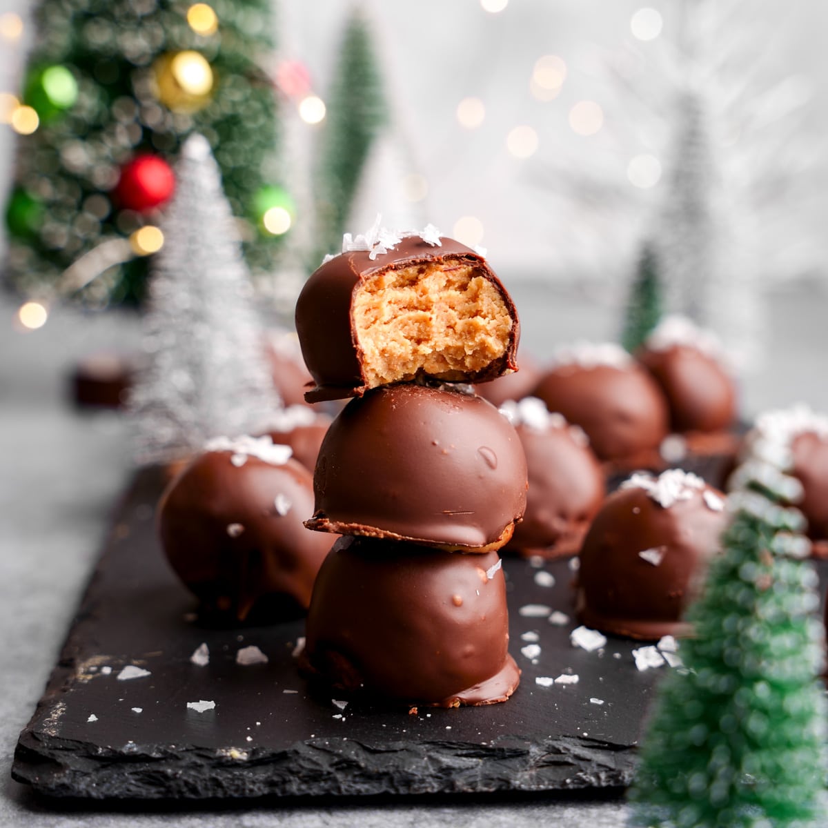 Peanut Butter Balls or buckeyes have always been a Christmas classic in my family. However, the peanut butter balls I grew up eating were neither healthy nor vegan. Therefore I wanted to create delicious vegan buckeyes using simple and clean ingredients so that everyone can enjoy this classic Christmas treat.